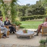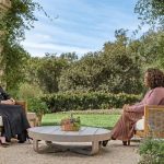 Harry and Meghan sat opposite Winfrey and side-by-side, holding hands during the interview that was conducted in a lush garden setting. The couple lives in Montecito, California, where they are neighbors of Winfrey. Meghan, who recently announced she is pregnant with the couple’s second child, wore an empire-style black dress with embroidery. Harry wore a light gray suit and white dress shirt, minus a tie.