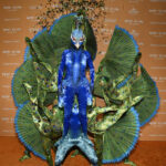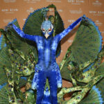 Klum called herself in costume “he” — proving the model did her research as male peacocks have elaborate tail feathers while the females have shorter, duller tails.