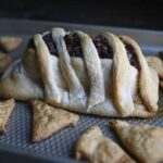 Spread dough on a cookie sheet and place cheese in the middle. Top with jam. (You won’t need all of it. Save what you don’t use to top burgers, add to a grilled cheese sandwich, or have on toast with a fried egg for breakfast.) Bring your dough up to seal the cheese and toppings in. Brush with beaten egg. Bake about 30 minutes for puff pastry and 20 to 30 minutes for other doughs, until golden brown.