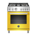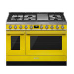 Bertazzoni and SMEG stock equipment like stoves, fridges and range hoods in fresh yellows.