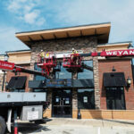 Workers with Weyand Sign and Lighting remove the front signage from Dino’s Sports Lounge on June 30, in Greensburg. (Shane Dunlap | TribLive)