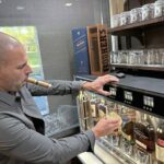 Jeff Mountain from Indiana Township pours Johnny Walker Blue from the self-serve station inside the cigar lounge at The Bocce House of Pittsburgh in O’Hara. (JoAnne Klimovich Harrop | TribLive)