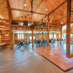 The barn’s interior keeps to its history while featuring some modern, rustic touches, such as black metal barn doors and original exposed wood beams. Two lofts, one of which is Seefeld’s office, overlook the 5,000-square-foot main hall.