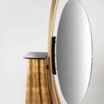 The “focus of this dressing mirror, constructed of solid cherry with wedge and aluminum accents, is on the gathering place for the ritual of adorning oneself,” he says. “The various sized sculpted drawers hold elements of decoration to celebrate one’s life: favorite jewelry, scarves, lingerie, a journal, etc. The adjacent shelf holds a vase of flowers or a glass of wine.”