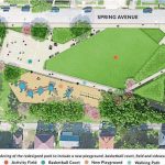 The design calls for an upgraded basketball half court near Spring Avenue with an updated playground area farther from the street. A large open activity field is shown surrounded by a walking path that separates the grassy area from the playground.