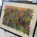 Painted with alcohol ink, Beaufort’s piece features brightly colored birds and flowers.