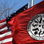 A Seneca Nation of Indians flag waves April 19, 2007, alongside an American flag during a news conference outside the Tribal Council building in Irving, N.Y.