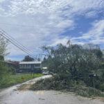 In West Virginia, a storm blew off part of a vacant building’s roof in Charleston, littering the street with bricks and closing the roadway to traffic Tuesday afternoon. Trees were dislodged from the earth by the roots and lay in roads, lawns and in some cases, on top of cars.