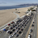 A line of vehicles snaked along the Pacific Coast Highway as motorists inched into a beachside parking lot in Santa Monica, where they had to show ID to receive a permit that allowed them to drive into the burn zone. They have to be out of the area by nightfall because a curfew remains in effect.