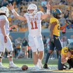 B.J. Foster’s pick early in the fourth quarter led to Devin Duvernay’s 13-yard scoring run. Kendall was intercepted on the next drive by Jamison at the West Virginia 18, and Ehlinger threw a lateral to offensive lineman Samuel Cosmi, who rumbled 12 yards into the end zone for a 35-17 lead.